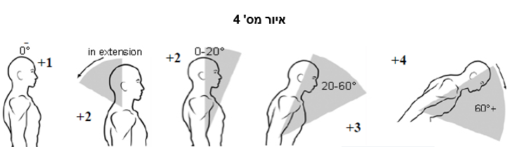 בפעולה זו נכנסות גם פעולות של הגו והרגליים. ניתוח REBA הכולל את כל הגוף ייקח בחשבון גם את הכיפוף בגו, כמו שנראה באיור מס' 4 ומודגם בתנועת המטפלת בתמונה מס' 5.