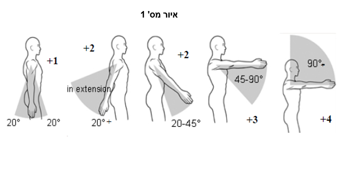 בפעולה זו נכנסות גם פעולות של הגו והרגליים. ניתוח REBA הכולל את כל הגוף ייקח בחשבון גם את הכיפוף בגו, כמו שנראה באיור מס' 4 ומודגם בתנועת המטפלת בתמונה מס' 5.