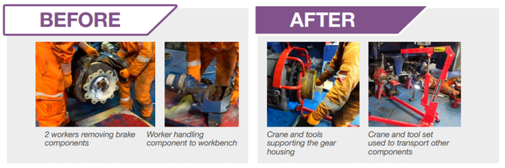 עובדי תחזוקה נאלצו לטפל ידנית בהרכבות כבדות של בלמים ורכזי גלגלים לצורך בדיקה ותחזוקה של מנופים. העובדים הסירו את הרכיבים, שמשקלם מגיע עד 52 ק"ג, ונשאו את מכלול ההנעה אל שולחן עבודה לצורך תחזוקה, לפני שהחזירו אותו למנוף. תהליך זה כלל, לעיתים קרובות, שני עובדים שנשאו את הרכיבים הכבדים בכפיפה ובמרחב מוגבל מתחת לקשת גלגל המנוף - תהליך שהגביר את הסיכון לפגיעות שלד - שריר עקב נשיאה ידנית.