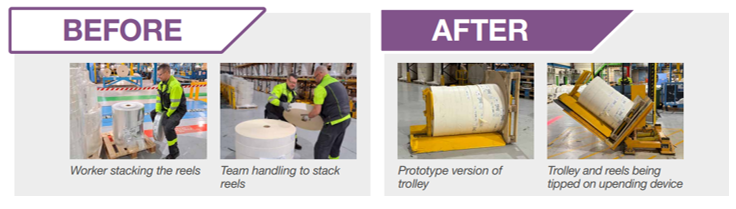 עובדים נהגו לעירום ידנית גלילי ניר למינציה, שמשקלם נע בין 20 ל-90 ק"ג. בשל גובה הערימה, חלק מהעובדים התקשו, פיזית, לבצע את הפעולה, ולכן צוות הייצור הפנימי והמחלקה ההנדסית פיתחו אב-טיפוס של "עגלה" ("טרולי") העשויה ממשטח עץ ודיקט.