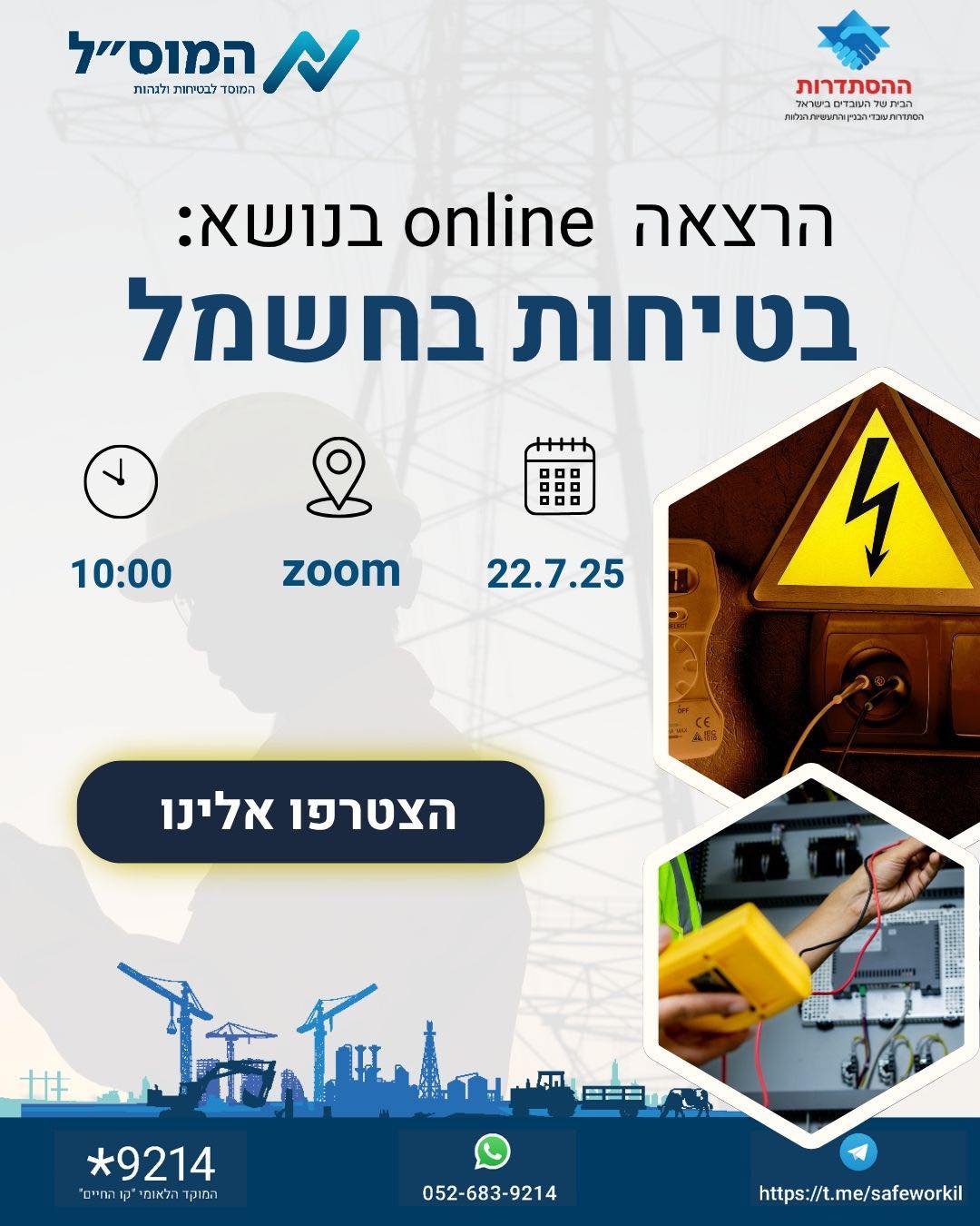 השבוע על הפרק: בטיחות בחשמל. נלמד לזהות מפגעים נפוצים, נבין מה אסור לעשות בשום פנים ואופן, ונענה על שאלות . מתי? יום שלישי הקרוב, בשעה 10:00 בבוקר. איפה? בזום. מהמשרד, מהנייד או מהשטח.