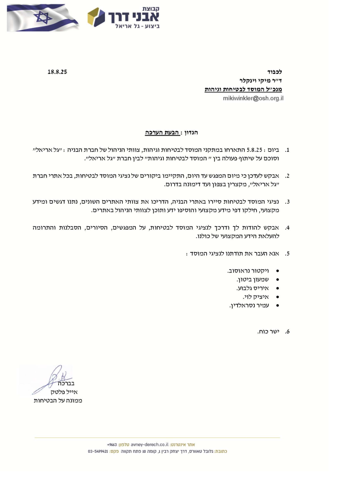 מכתב הערכה: שיתוף פעולה בין המוסד לבטיחות וגהות לחברת "גל אריאל"