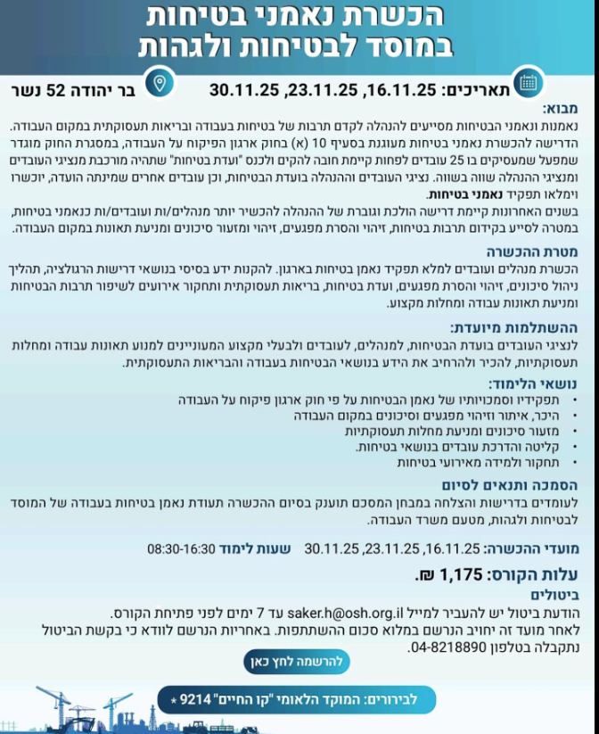 הכשרת “נאמני בטיחות” של המוסד לבטיחות ולגהות המחוייבת בחוק ארגון הפיקוח על העבודה מיועדת עבורכם/ן.