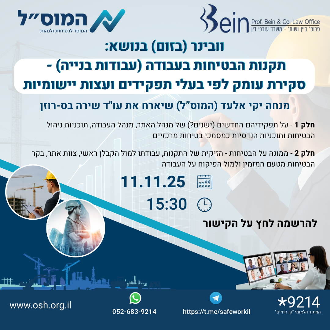 לאור ההצלחה של הוובינר שקיימנו לפני כחודש ולאור הפניות הרבות שקיבלנו להרחבת המידע וההבנה בתקנה החדשה לבעלי התפקידים אנו מקיימים ובינר המשך בנושא תקנות הבטיחות בעבודה (עבודות בנייה) סקירת עומק לבעלי תפקידים ועצות יישומיות.