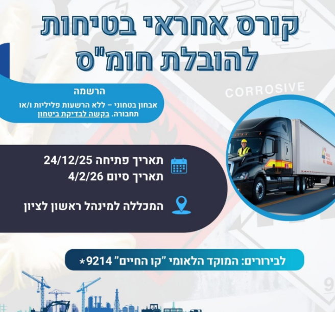 קורס אחראי בטיחות להובלת חומ"ס - ההרשמה בעיצומה, הכנסו והרשמו גם אתם