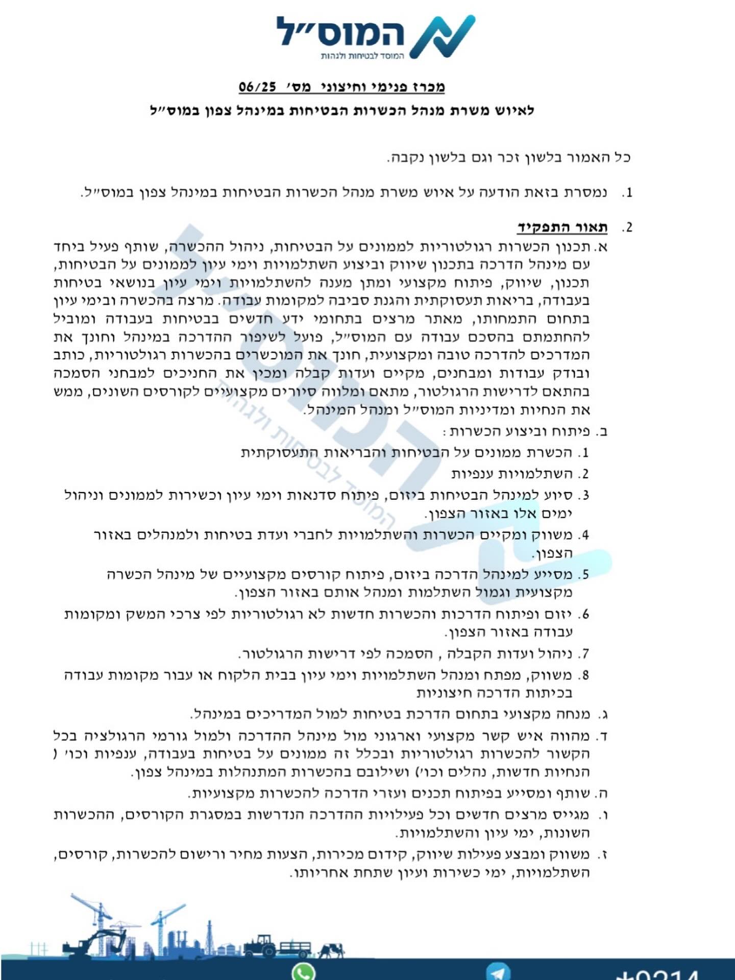 נפתח מכרז למשרת מנהל הכשרות הבטיחות במינהל צפון במוס"ל