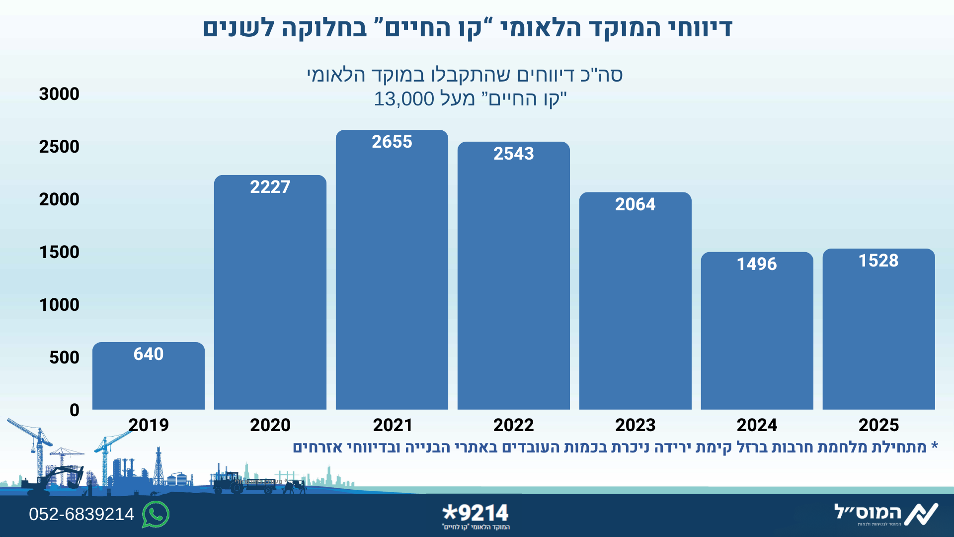 המוקד הלאומי "קו החיים" המופעל על-ידי המוסד לבטיחות ולגהות (המוס״ל), ממשיך לשמש כלי מרכזי לדיווח ציבורי על ליקויי בטיחות באתרי בנייה.