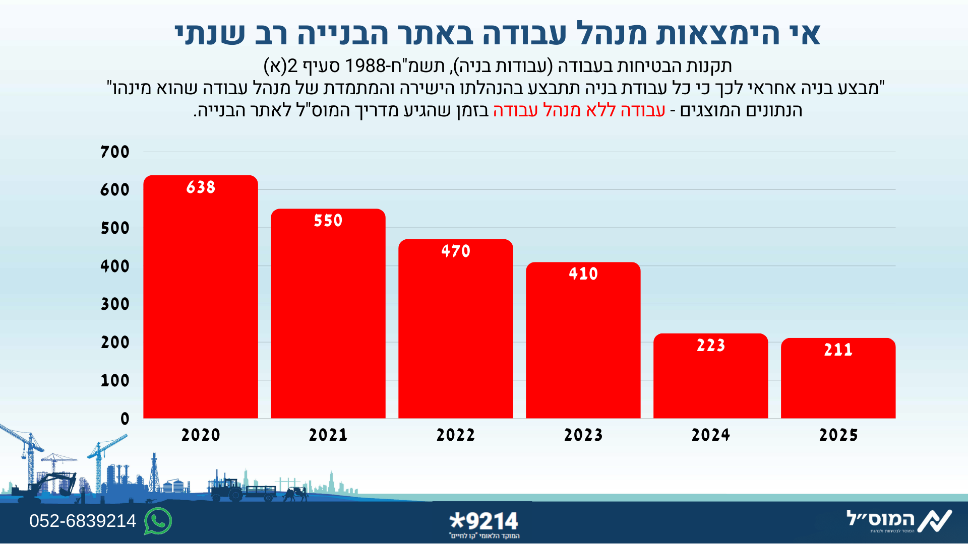 בשנת 2025 נמצאו כ 211 אתרים ללא הימצאות מנהל עבודה באתר הבנייה.