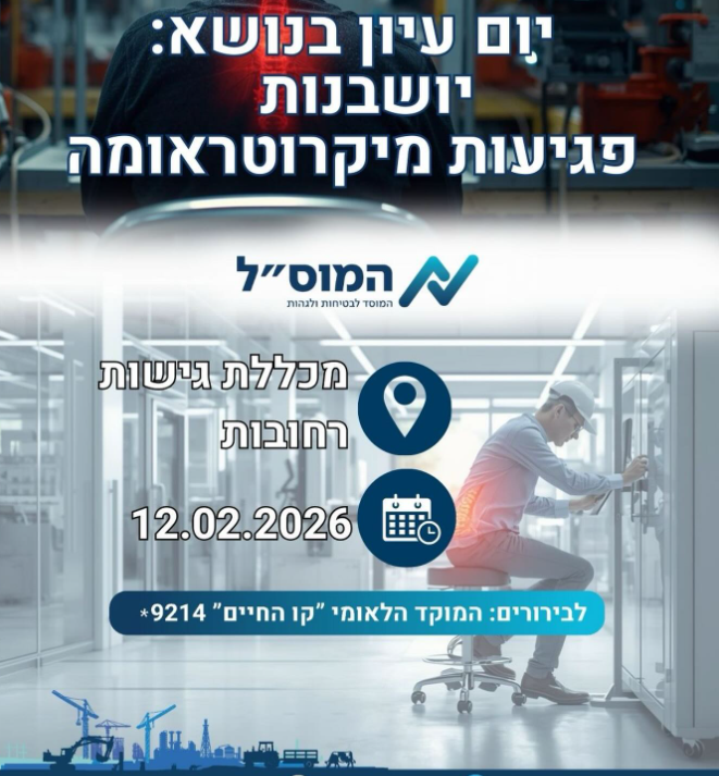 אחריות על מניעת “פגיעות מיקרוטראומה” היא בידיים שלכם. ב-12.2 אנחנו נפגשים ברחובות כדי ללמוד איך הופכים את סביבת העבודה ממסוכנת לבריאה, ואיך בונים תוכנית ארגונומית שתשמור על הנכס הכי חשוב שלכם: העובדים.