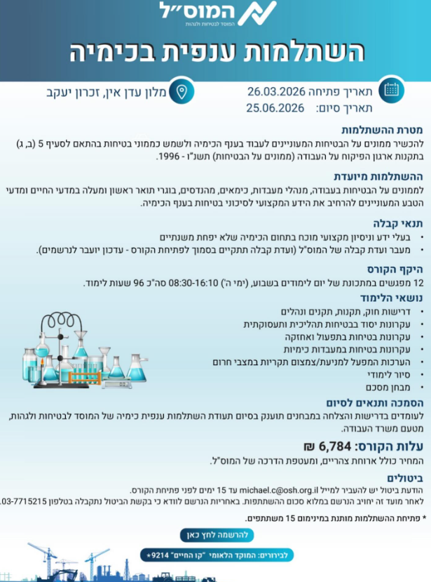 ב-26.03 אנחנו פותחים בזכרון יעקב את ההשתלמות שתהפוך אותך לסמכות המקצועית הגבוהה ביותר בענף הכימיה (בהתאם לתקנות הממונים).