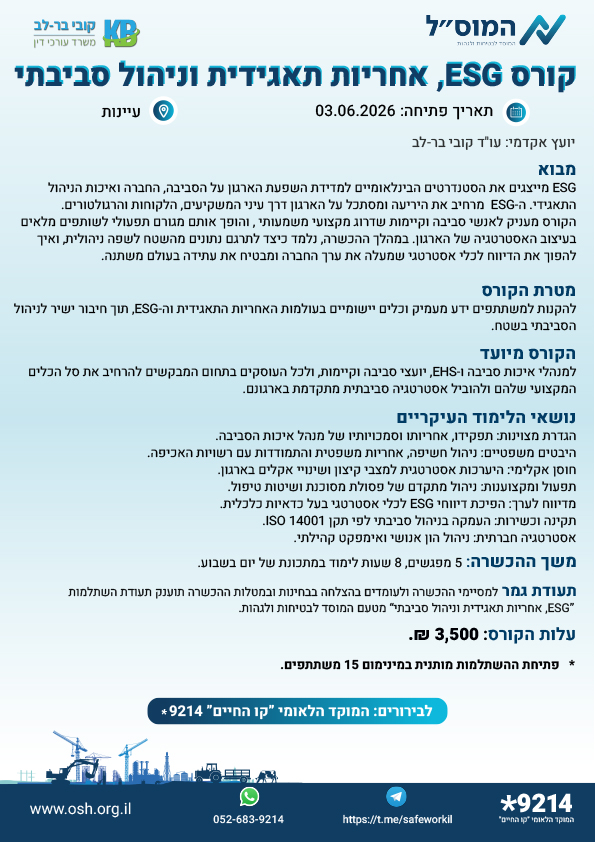 אנחנו הופכים את הנתונים מהשטח לכלי אסטרטגי שמעלה את ערך החברה שלכם. קורס ESG, אחריות תאגידית וניהול סביבתי של המוס”ל.